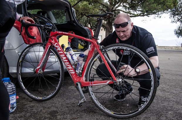 Team IG-Sigma Sport’s training bikes double as spare machines for races, where they are carried on the roof of the team cars. Because these “second” bikes are used by the riders between races, any work they require becomes another duty for Davis on the weekend of competition.