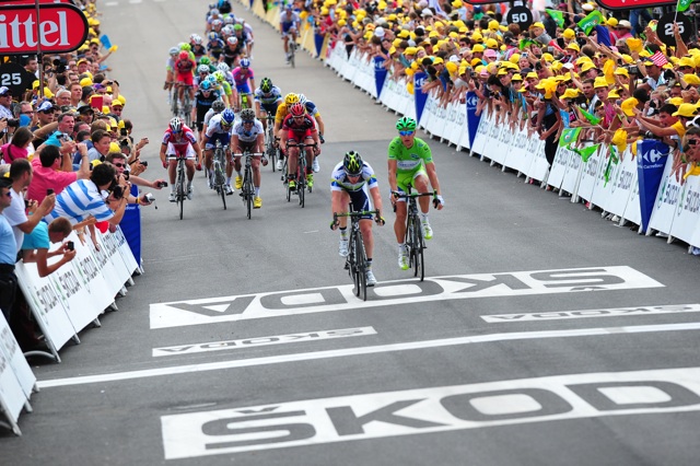 Matt Goss leads Peter Sagan to the finish line, but the positions were reversed by the commissaires after Goss switched lines during the sprint