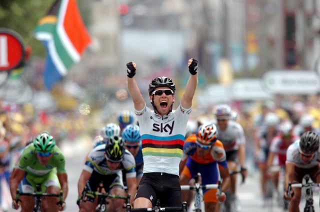 An elated mark Cavendish punches the air in triumph after arguably the greatest of his 22 Tour de France stage victories
