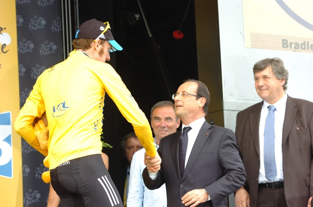 A presidential handshake for Bradley Wiggins from France’s first citizen, Francois Hollande