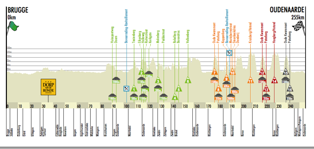 A relentless 255km course from Bruges to a new finish at Oudenaarde will include eight sections of cobbles and sixteen short, sharp, and extremely challenging climbs – ‘muurs’ – including the Koppenburg and three ascents of the Oude Kwaremont and Paterberg.