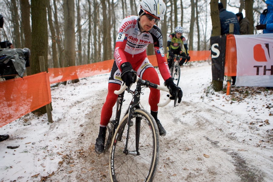Sven Nys calls on his legendary bike handling skills to remain upright on a Hoogerheide course covered in snow and ice