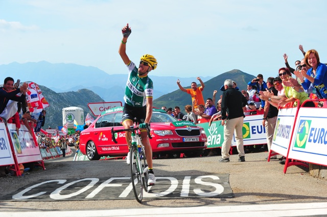 More than nine minutes up the road from the race leading trio, Antonio Piedra celebrates victory after beating his breakaway companions to the summit of the final climb