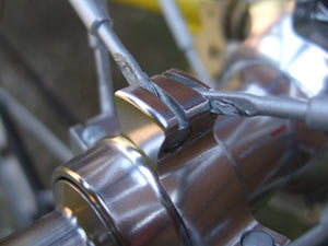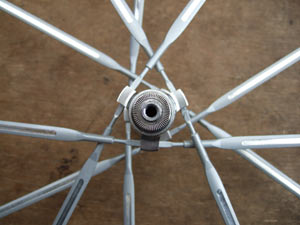 In fact, the first generation of Vuelta wheels employed a cranked spoke end of a type long discarded by most wheel manufacturers because it makes secure spoke location problematic. The aim was to allow the use of a conventional drilled hub flange; of course, the fat spoke could not pass through the hole. By cranking the end, it was possible to pass only the tip of the spoke through the flange. Since such a design is prone to allowing the spoke to ‘unbend’ and pull through the flange under high spoke tension, Vuelta left the spokes softly tensioned. This meant that the early wheels were both soggy and prone to fatigue-related spoke breakage.