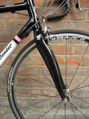 Continental provide the confidence-inspiring Force and Attack tyres, with a 22mm front tyre matched to the 24mm rear tyre giving good traction and great speed. Deda supply bars and stem and there’s a Condor branded carbon seatpost propping up the pink-striped Fizik Arione saddle – the veritable icing on the cake. A pair of Condor’s excellent logo’d carbon bottle cages completes the spec. You’ll be paying out £2,800 for this little lot, which does seem good value for money. The Leggero is available in less expensive builds however, so you can get a slice of the action at a more affordable price.