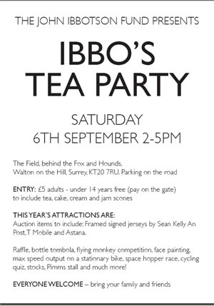 We are holding a tea party on the 6th September and a ‘cake quest’ bike ride on the 12th October. All information can be found on our website: www.johnibbotsonfund.com.