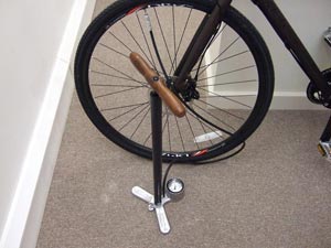 The Flip-Thread chuck is also designed to stow away in a clasp formed as an integral part of the foot, relying on the elasticity of the 47 inch long rubber hose to keep it in place while at the same time securing the handle. The barrel and piston are in steel, saving weight and maximising longevity without obviously compromising on aesthetics. The foot is effectively a tripod, ensuring a good degree of stability on uneven surfaces. Four rubber buttons on the underside prevent marking of soft floors.