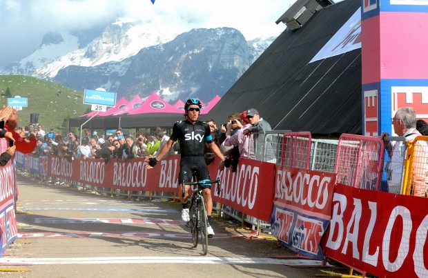 Rigoberto Uran (Team Sky) jumped to third overall at the Giro d’Italia ahead of team leader Bradley Wiggins (Team Sky) after winning the first mountain stage of the race.