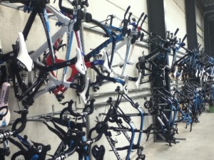 An entire wall of the facility is hung with framesets, sans wheels, but equipped with saddles, cockpits, groupsets, and chains. The Pinarello Dogmas and Graals are stored in alphabetical order; a surname and small, printed flag denoting the place in which each rider’s frame should be hung.