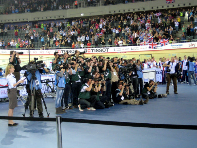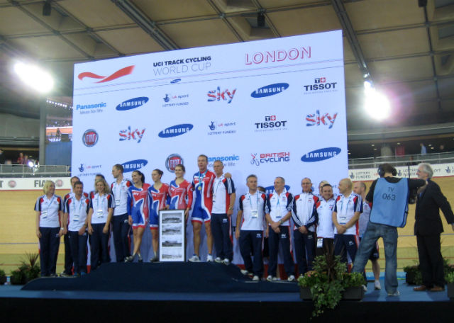 Great Britain finished the London-leg of the World Cup, which doubled as the Olympic test event, as team winners having won eight medals, including seven in Olympic disciplines. From left to right on the top step of the podium – Victoria Pendleton, Laura Trott, Jess Varnish, Sir Chris Hoy and head coach Shane Sutton.