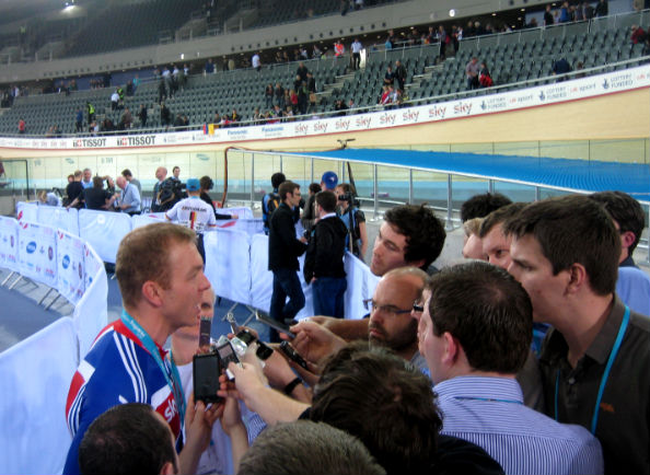 The man of the moment, Sir Chris Hoy, speaks to the media after winning sprint gold, his third medal of the event having already topped the kierin podium and claimed team sprint bronze with Jason Kenny and Ross Edgar.