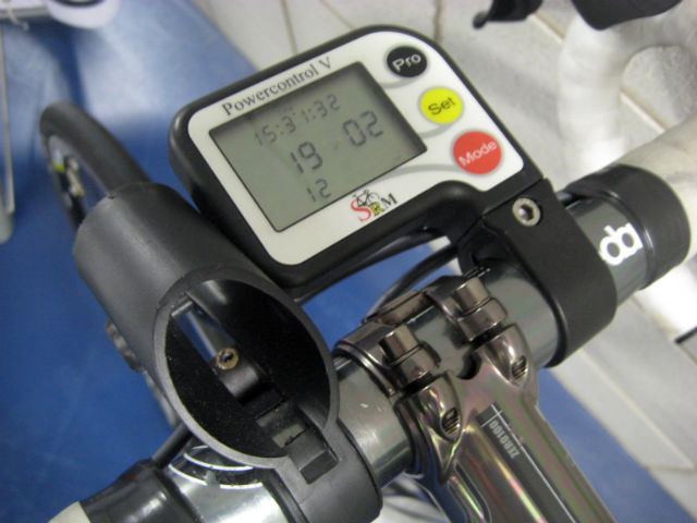 A closer look at the cockpit, complete with an SRM PowerControl 7 computer, feeding back data from the cranks. So whose bike is it?