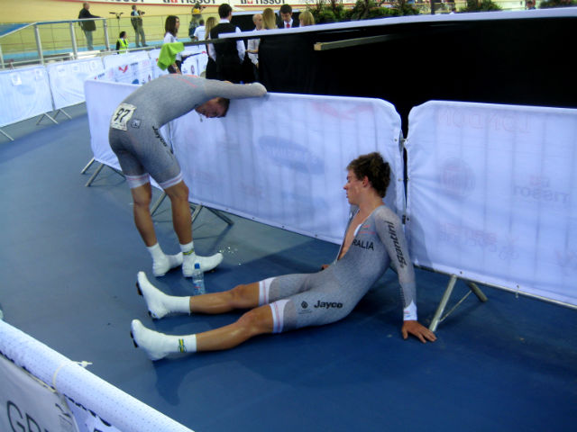What does it feel like to ride a 4km team pursuit? Here’s your answer, with Rohan Dennis (standing) and Alexander Edmondson (sitting) in a world of pain after beating Great Britain – Ed Clancy, Geraint Thomas, Peter Kennaugh and Steven Burke – to gold.
