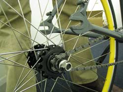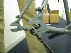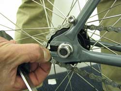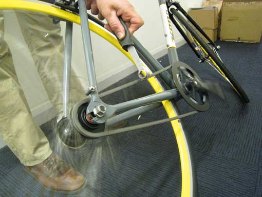 This should leave you with a centred wheel and 5mm chain slack at the tight spot. Remember that mental note you took of the crank orientation at the newly-found tight spot? Position the cranks thus when refitting the wheel and you will avoid the need to go through step 12 to find it again. Finally, hold the cycle with the rear wheel off the ground and, keeping fingers well away from the chainring and chain, turn the pedals to get the transmission spinning. Set the cycle on its side and, if the chain is properly tensioned, it will not try to jump sideways off the sprocket even if tapped sideways with the spanner. Make sure the nuts – drive-side a little more so – are correcty tightened and ride away.