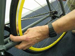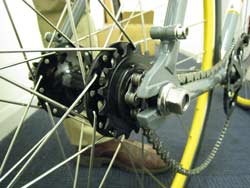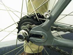 Refitting the wheel is, naturally, the same process done in reverse order. If you are building a new bike or fitting a new chain, it is bad form to cut it so short you can’t get it over the sprocket as shown in pic 3. Once the wheel is back in the frame and the chain in position on both sprocket and chainring, pull the wheel back until the chain is taut (8). Lessen your pull on the wheel a little and you will see the chain drop slightly – about 5mm is plenty. Tighten the drive-side tracknut (9). Sighting along the wheel, pull or push the opposite side of the rim sideways until it is centred in the stays, then tighten the left-hand nut (11).