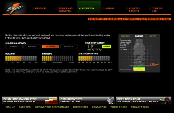 The Gatorade website (http://www.gatorade.co.uk) is worth a visit to find out more about its products and how they can help you perform better. The “Fluid Loss Calculator” helps you calculate how much fluid you need during any type of exercise.