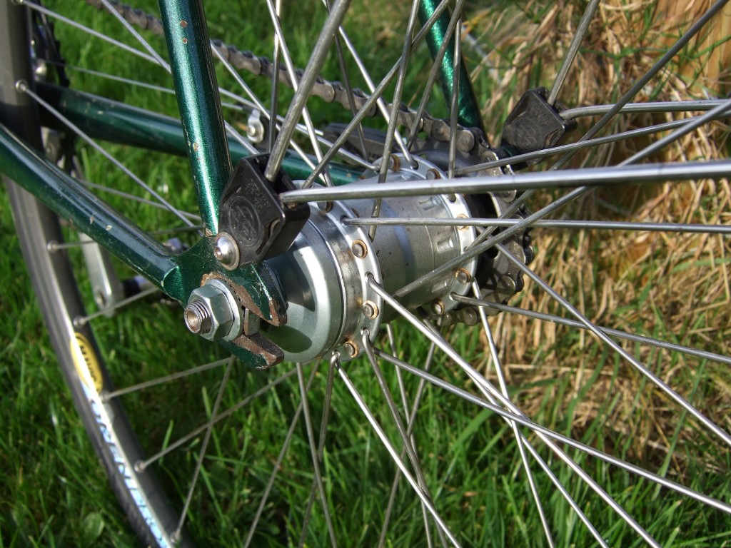 Shifting is immediate and can be done while stationary. Middle or normal gear gives direct drive, locking the mechanism so the wheel and sprocket turn together. The hub is shielded, not sealed, so there is no friction from this source. Add to this the large diameter of the hub bearings and balls and you have an exceptionally free-running device, although one you do not want to submerge… For sure, the hub is more than able to keep out wet weather.