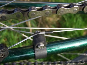 The final consideration for anyone thinking of equipping their fixed bike with this hub is control cable routing. The writer rooted around in his box of things that clamp around tubes and came up with a Deda Dog Fang, a Travel Agent, a cyclo-cross front mech cable pull-reversing pulley thingy and one of those small diameter round plastic clamps you get with rear lights and played around with them to achieve the result shown. The pulley wheel is perhaps the hardest part to get right; a Sturmey wheel with tube clip will do the job nicely.