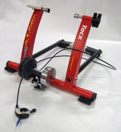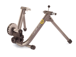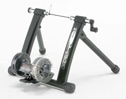 Magnetic resistance – These units use a metal plate spinning inside a magnetic field. A simple cable operated lever control at the handlebars moves the magnet to create more resistance. Most of the sophisticated electronic trainers use magnetic resistance, However they aren’t always as smooth as fluid trainers.