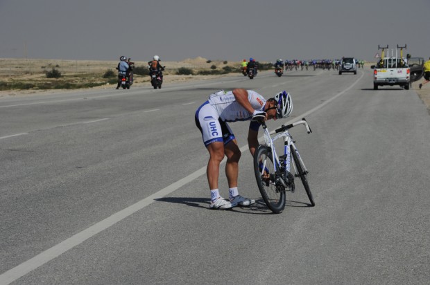 Lars Boom punctured at an unfortunate time in stage four, which cost him his third place overall, while Fabian Cancellara suffered a similar fate. And on stage five, riders were dropping off the back of the bunch for a wheel change with alarming regularity, particularly on the long, back straight of the circuitous route. Alexander Kristoff (Katusha), Martin Kohler (BMC Racing) and a disgusted-looking Danny Pate (Team Sky) were just a handful of riders to suffer. The roads may be flat, but with the winds and road debris wreaking havoc, don’t let anybody tell you riding through the desert is easy.