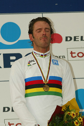 This brilliant start to what was to become the Italian’s greatest season (a further six Giro stage wins added to his two victories in the spring classics) was almost derailed by another falling out with the Tour De France hierarchy, and a characteristically impetuous decision to retire. His decision was reversed by the persuasion of Francesco Ballerini, the Italian team manager, who, recognizing that Cipollini’s speed remained untouched by his advancing years, staked the efforts of a team packed with sprinting talent, including a young Alessandro Pettachi, on the charismatic veteran. In a precursor to the Great Britain team’s ride in support of Mark Cavendish at Copenhagen last October, the Italians controlled the race by setting an impossibly high tempo before launching Cipollini off the front in the closing metres. Rising brilliantly to the occasion, Cipollini, crossed the finish line in  the Belgian town of Zolder ahead of two more supreme sprinting talents, Erik Zabel and Robbie McEwan, at the end of 185km raced at an average speed of nearly 46kmh.
