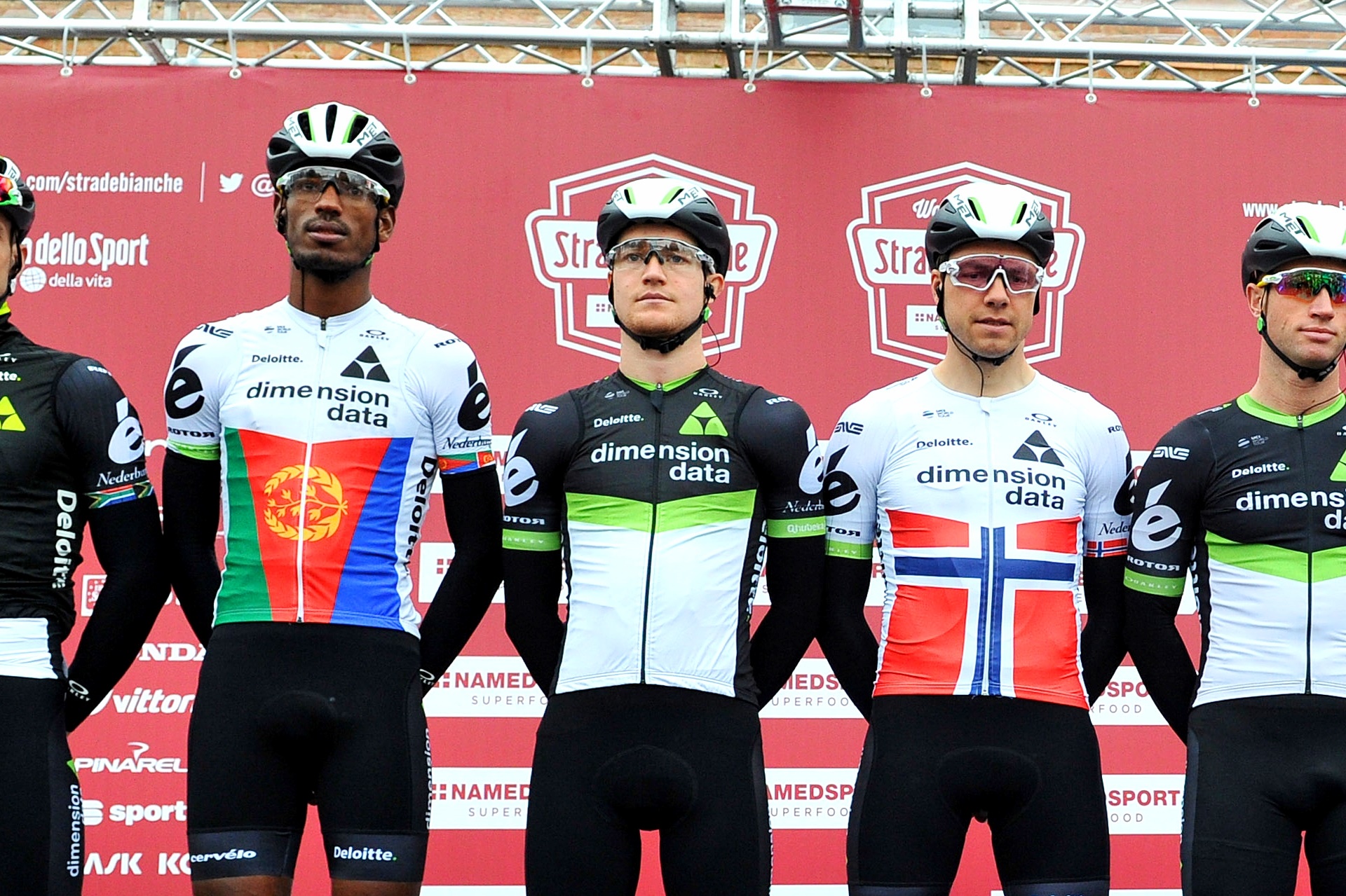 Scott Thwaites (centre) joined Dimension Data in the winter and will make his Milan-San Remo debut on Saturday (Pic: RCS Sport)
