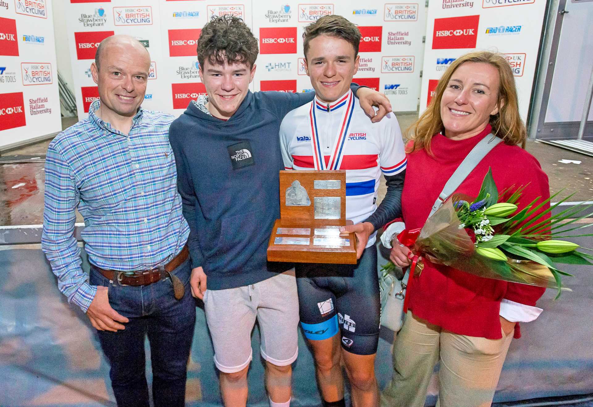 Pidcock celebrates his national criterium success with his family (Pic: Allan McKenzie/SWpix.com)