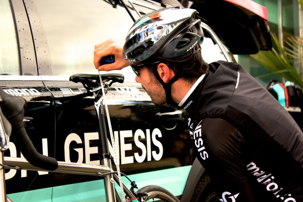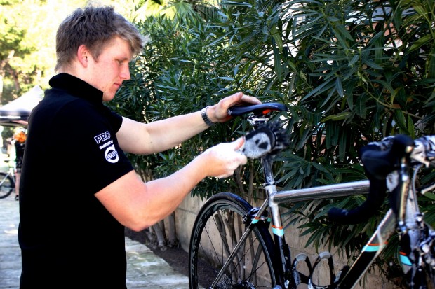 The training camp in Mallorca has provided the 2014 team’s first international engagement. Hayes and soigneur Andy Evans set off from Milton Keynes almost as soon as the team presentation had finished, crossing the English channel through the Eurotunnel, stopping overnight in Reims, and driving through Spain before completing the journey to Mallorca by ferry. Arriving two days later, on the day the riders boarded a flight from Gatwick, the pair had time to “set up shop”, allowing the riders to check in without unnecessary delay and proceed immediately to the business of minutely adjusting their new machines.