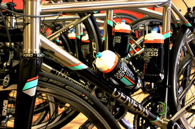 Hayes is responsible for a raft of equipment, including the race bikes of much of the team, which are stored securely at the service course. Each rider has at least two bikes: a race bike, and a training bike. Senior riders have a third bike: a spare to be deployed should the race bike develop an irremediable mid-race problem. The race bikes are the latest, fourth generation of the Genesis Volare Team bike. For new members of the team, the spare and training bikes are version three machines. The riders retained from last year will continue to use the second iteration Volare Team, fitted with a mechanical Shimano Dura-Ace 9000 groupset, as a training bike.