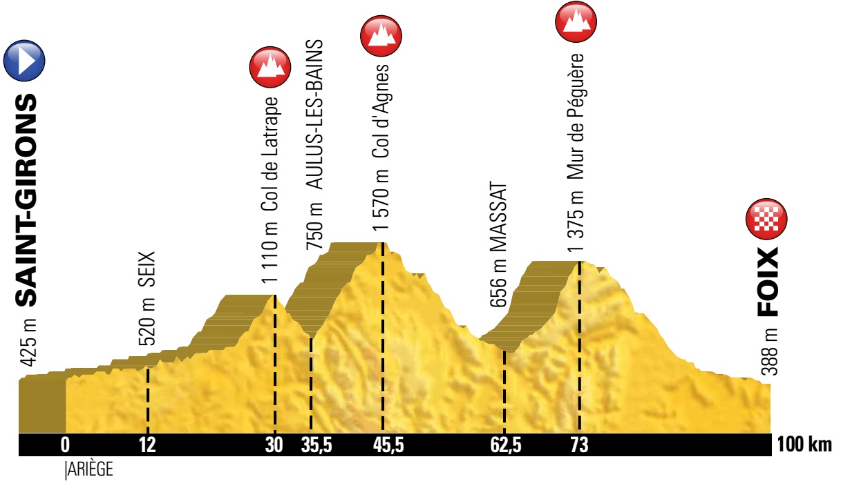 Lessons should have been learned by the time of this 100km Tour de France stage, but with the Col de Latrape, Col d’Agnes and finally Mur de Peguere – whose slopes get as steep as 18 per cent gradient – there’s plenty of chance for a GC contender to make a big difference on what should be an intense day.