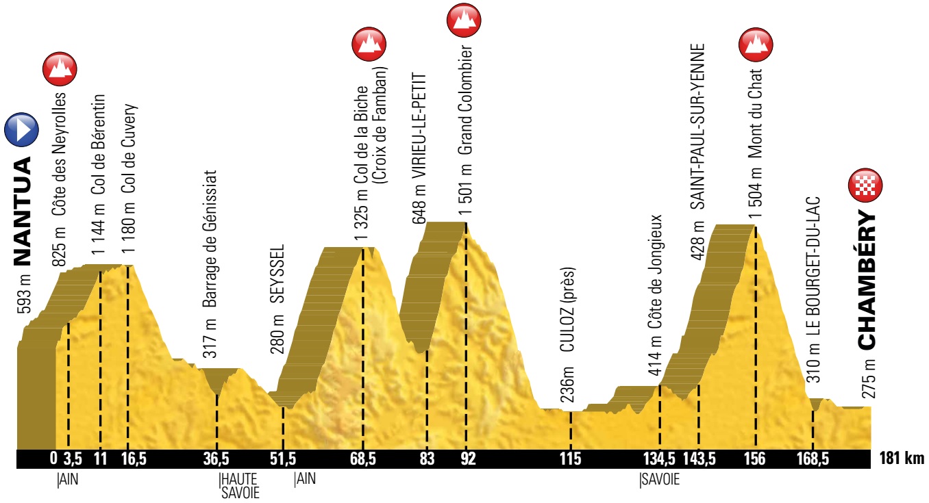 Still in the Jura mountains, the 181km stage boasts three huge climbs – the Col de la Biche, Grand Colombier (from its steepest side) and the Mont du Chat.