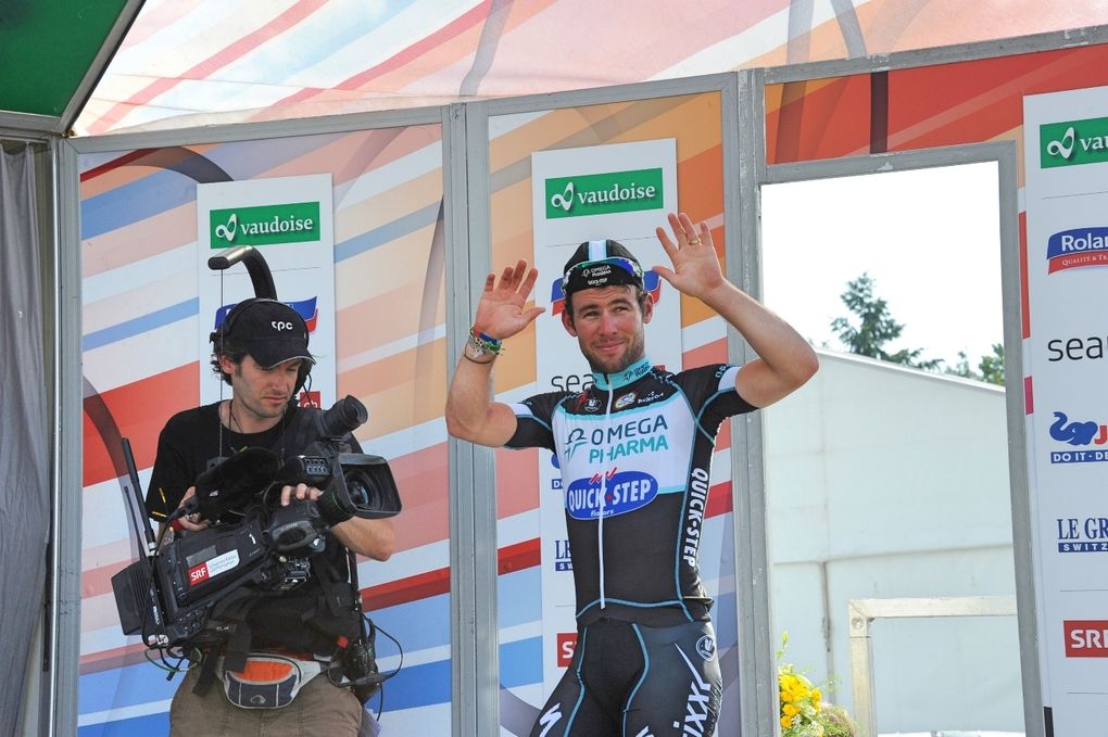 Mark Cavendish celebrates in front of the TV cameras after winning a stage at last year’s Tour de Suisse (pic: Sirotti)