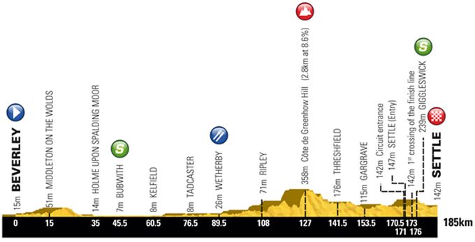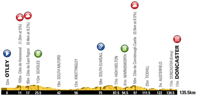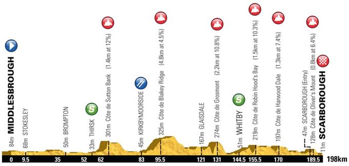 With 2,593m of climbing and six King of the Mountains ascents ((Sutton Bank, Blakey Ridge, Grosmont, Robin Hood’s Bay, Harwood Dale and Oliver’s Mount), including a final climb less than 10km from the finish, the race will likely be broken up for a sprint from a reduced group or solo winner on the seafront in Scarborough.