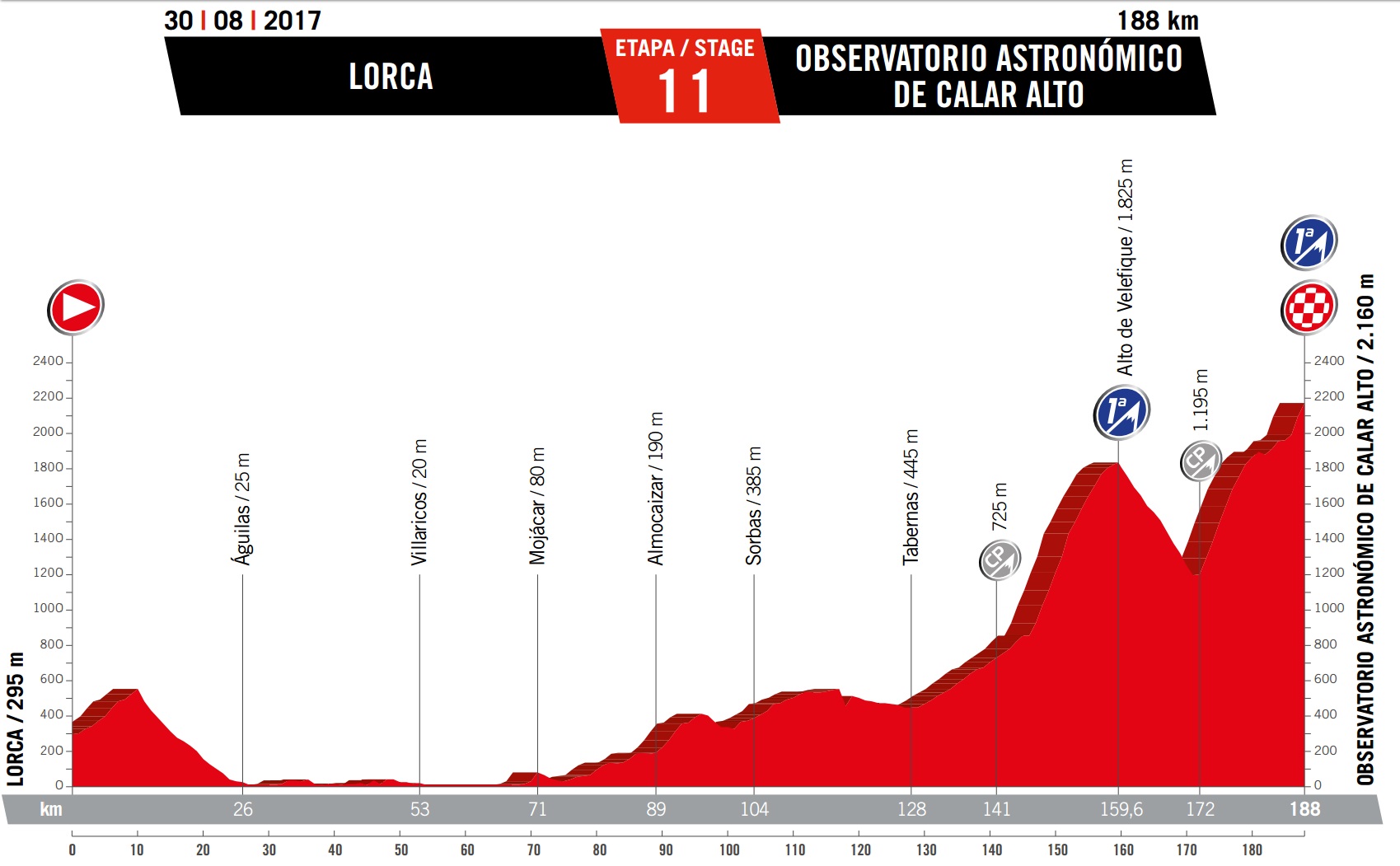 Wednesday August 30: stage 11 – Lorca to Observatorio Astronimico de Calar Alto, 188km summit finish