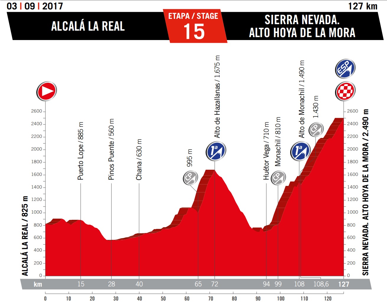 Sunday September 3: stage 15 – Alcala la Real to Sierra Nevada (Alto Hoya de la Mora), 127km summit finish