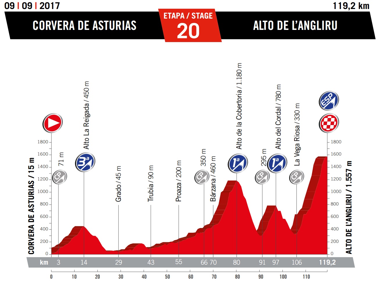 Saturday September 9: stage 20 – Corvera de Asturias to Alto de l’Angliru, 119.2km summit finish