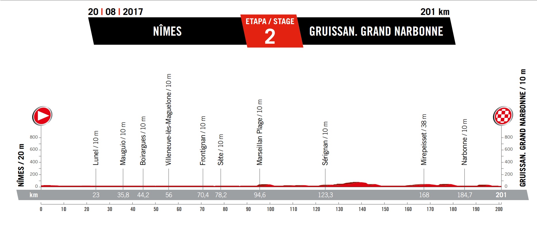 Sunday August 20: stage two – Nimes (FRA) to Gruissan (FRA), 201km