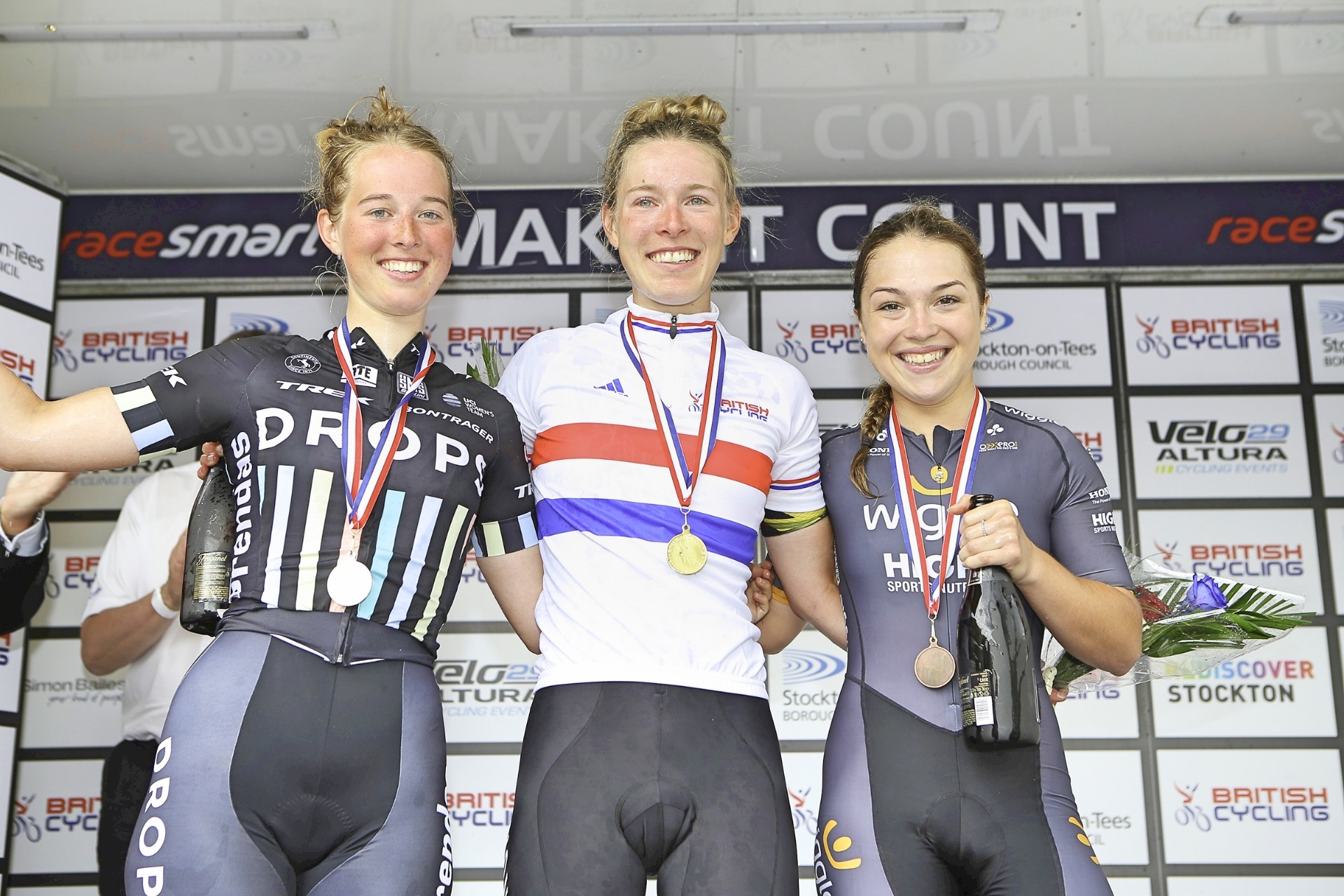 Barnes is flanked by younger sister Alice and Wiggle-High5’s Lucy Garner on the final women’s podium (pic: Allan McKenzie/SWpix.com)