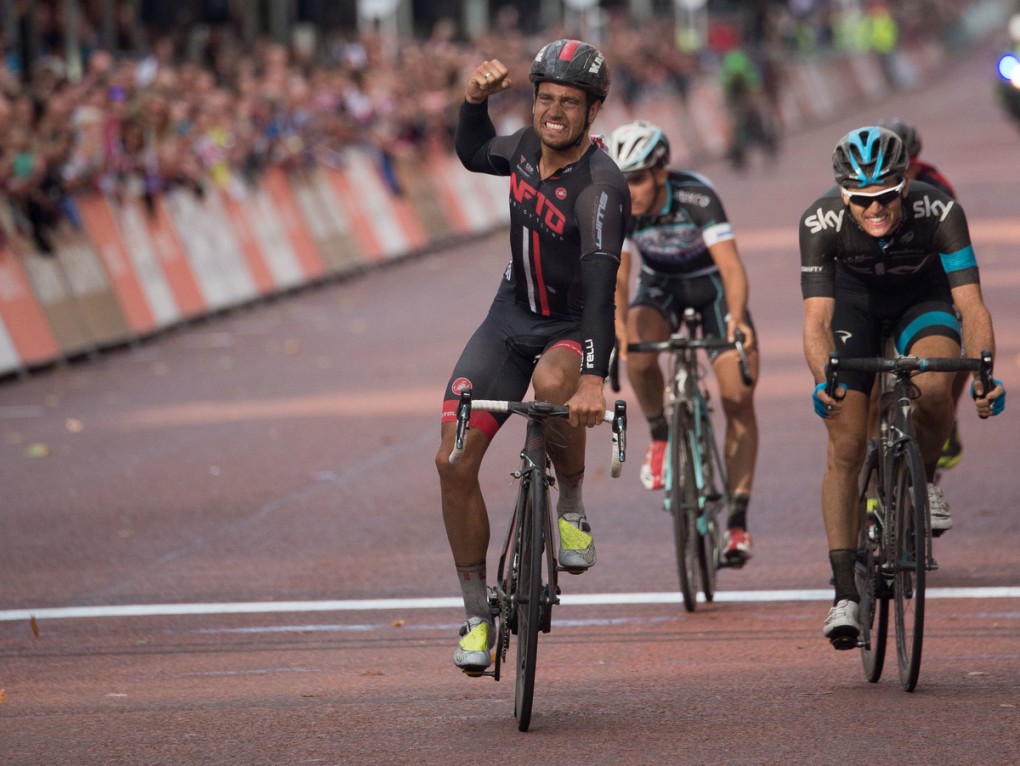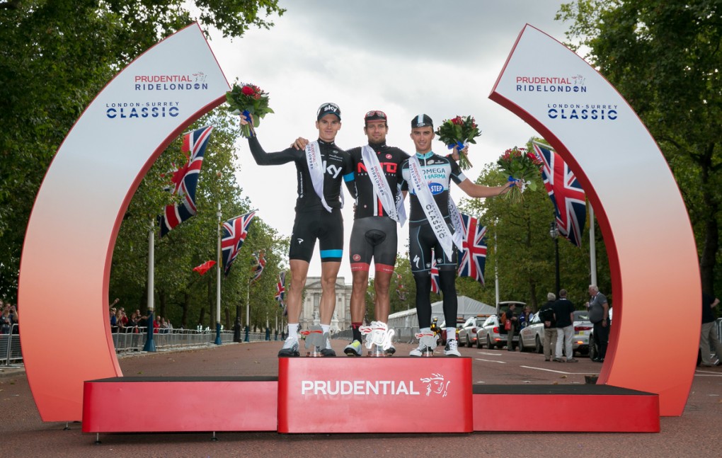 Adam Blythe (NFTO) sprinted to RideLondon-Surrey Classic victory on The Mall, leading home a British one-two ahead of Ben Swift (Team Sky).