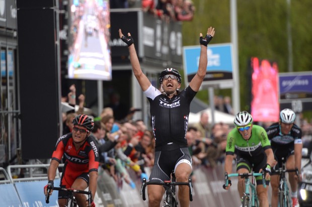 The Swiss star timed his sprint to perfection, launching from the wheel of Sepp Vanmarcke (Belkin) and seeing off the late challenge of Greg Van Avermaet (BMC Racing), who was pipped on the line for the second time this season after losing in similar fashion to Team Sky’s Ian Stannard at the Omloop Het Niewsblad in February.