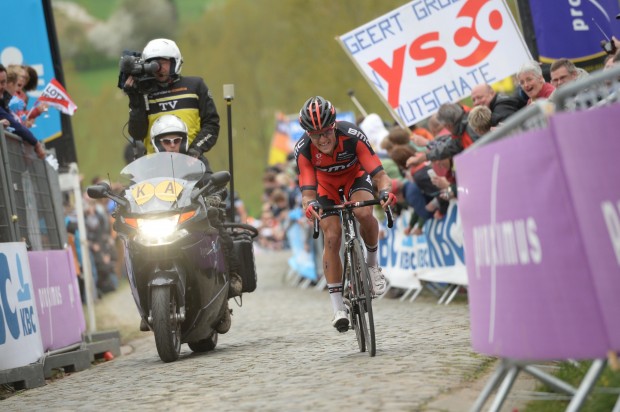 Oude Kwaremont served as a launch pad for Cancellara for a second year, but he could not shake Vanmarcke, the man with whom he contested victory at last year’s Paris-Roubaix. Their effort reduced the lead of Van Avermaet and Vandenbergh almost instantly, cutting it to just 13 seconds. The BMC man, undoubtedly warned on the radio of the ensuing danger, took off again, but could not shake Vandenbergh, the latter rapidly becoming the strongest card OPQS had to play.