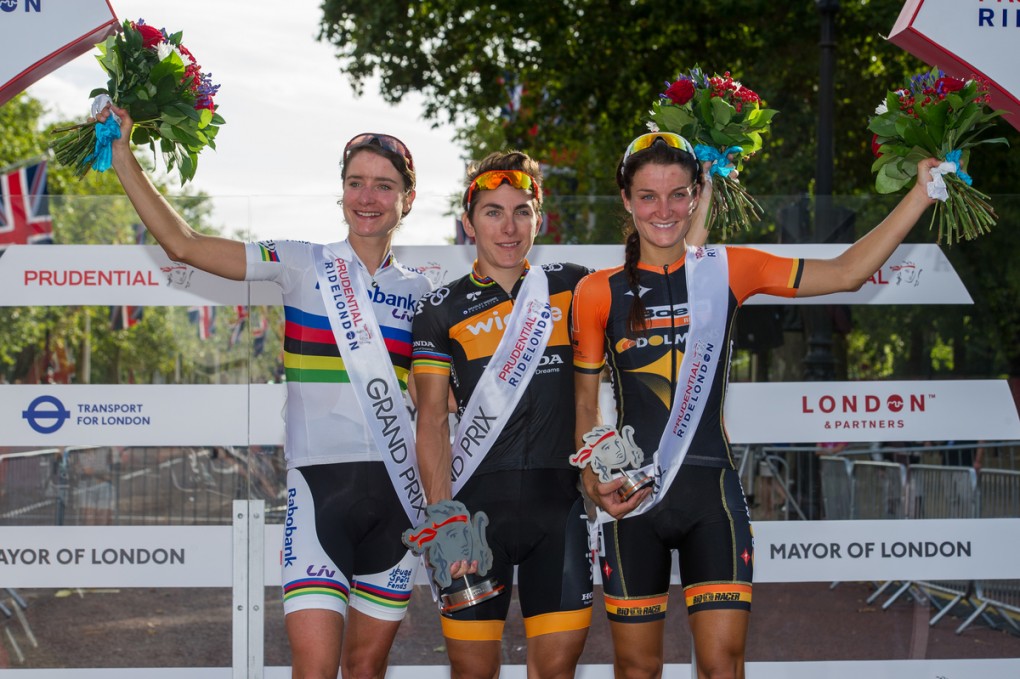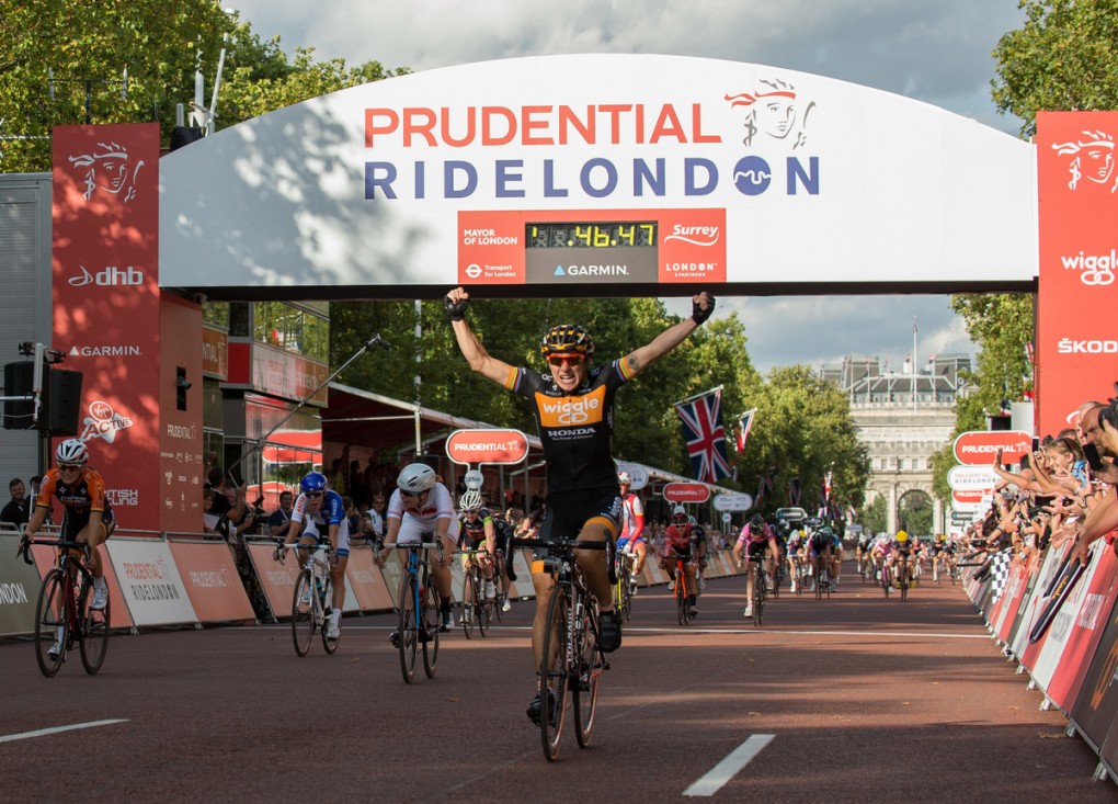 Giorgia Bronzini (Wiggle-Honda) sprinted to victory in the RideLondon Grand Prix on The Mall, beating Marianne Vos (Rabobank Liv Women) in a photo finish.