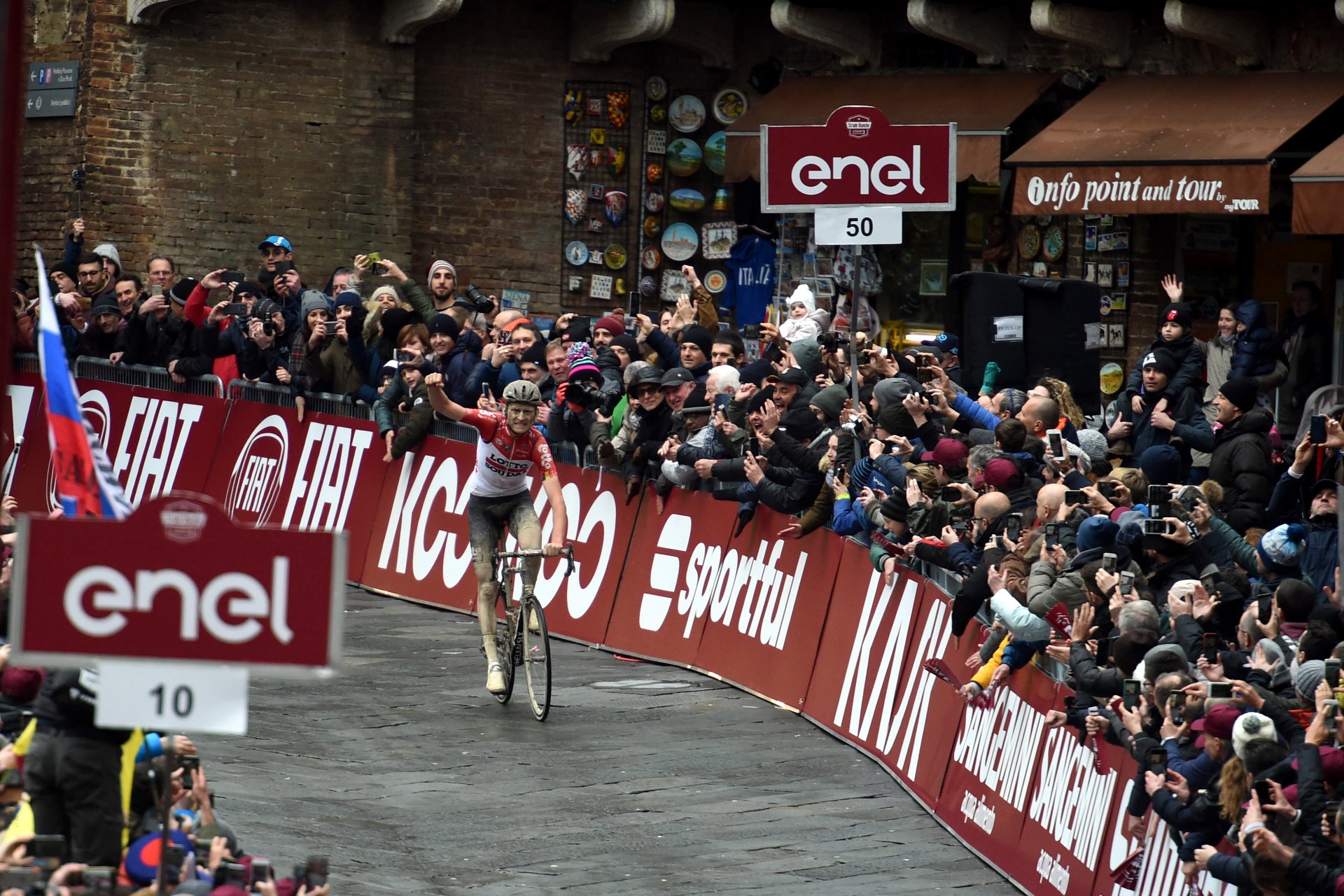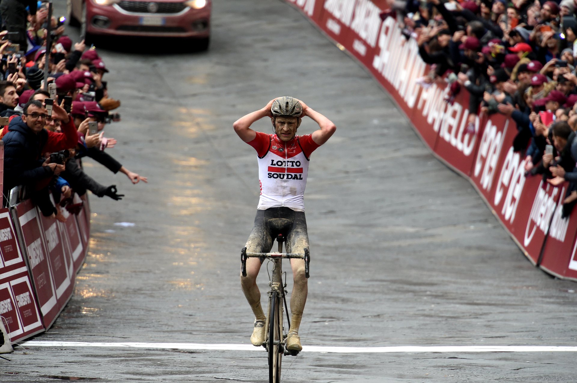 Tiesj Benoot (Lotto-Soudal) cemented his tag as a future star by claiming his first ever pro win – soloing to victory at a mud-splattered Strade Bianche.
