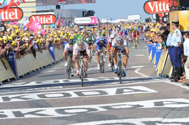 Lotto-Belisol appeared to have led Greipel to victory, but Kittel found an extra burst on the line to beat his compatriot and claim his second stage win of this year’s Tour after claiming victory in Corsica on the opening stage.