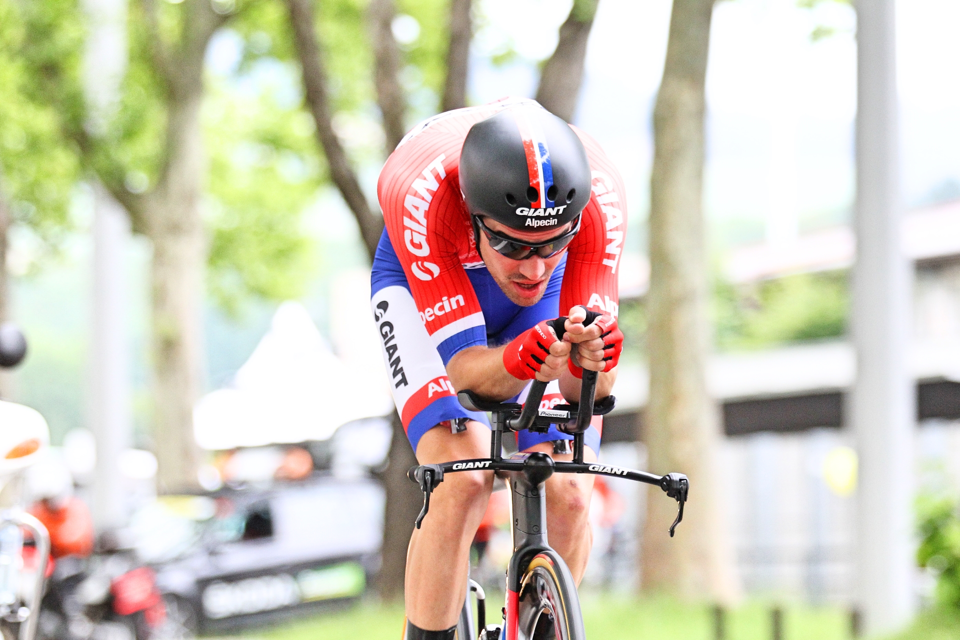 Dumoulin, in the red, white and blue skinsuit, paid tribute to the victims of the terror attack in Nice, for which a minute’s silence was held before the stage, after storming to victory on the testing course.