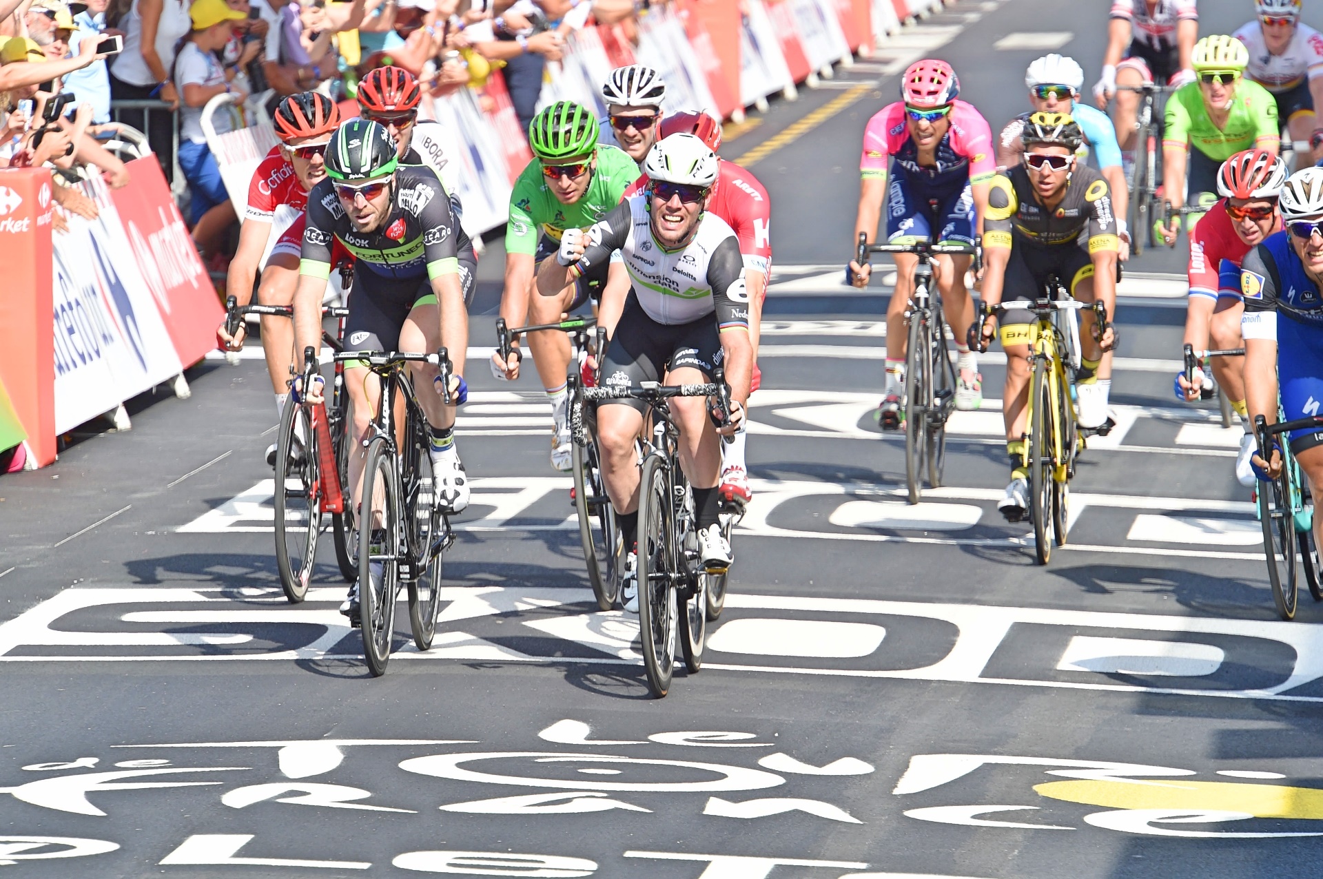 As the two went wheel-to-wheel down the middle, fellow Brit Dan McLay (Fortuneo-Vital Concept) made a late charge to take third place, but Cavendish would not be denied yet another sprint victory.
