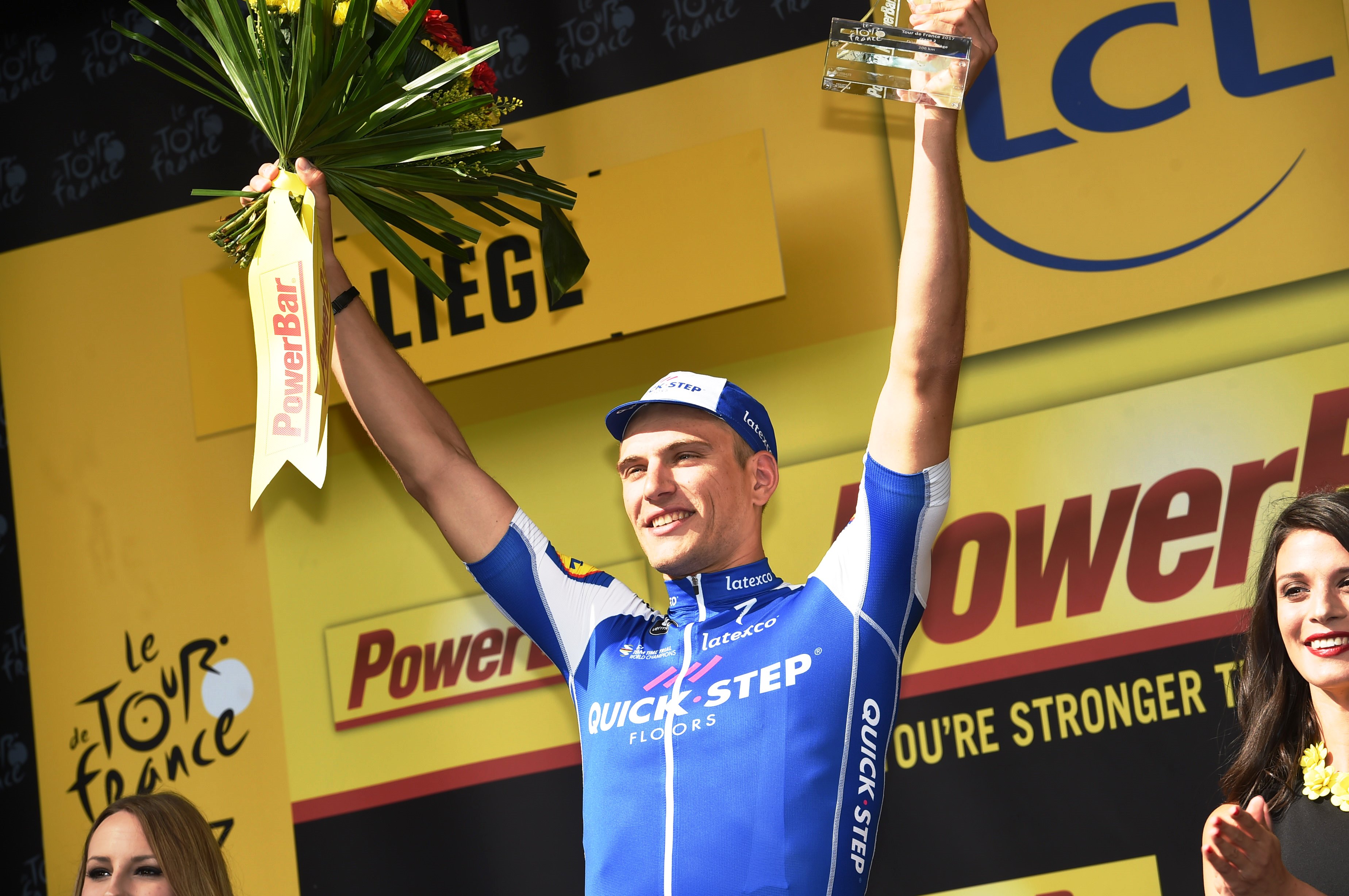 Marcel Kittel (QuickStep Floors) sprinted to victory on stage two of the 2017 Tour de France in Liege after a frantic bunch sprint.