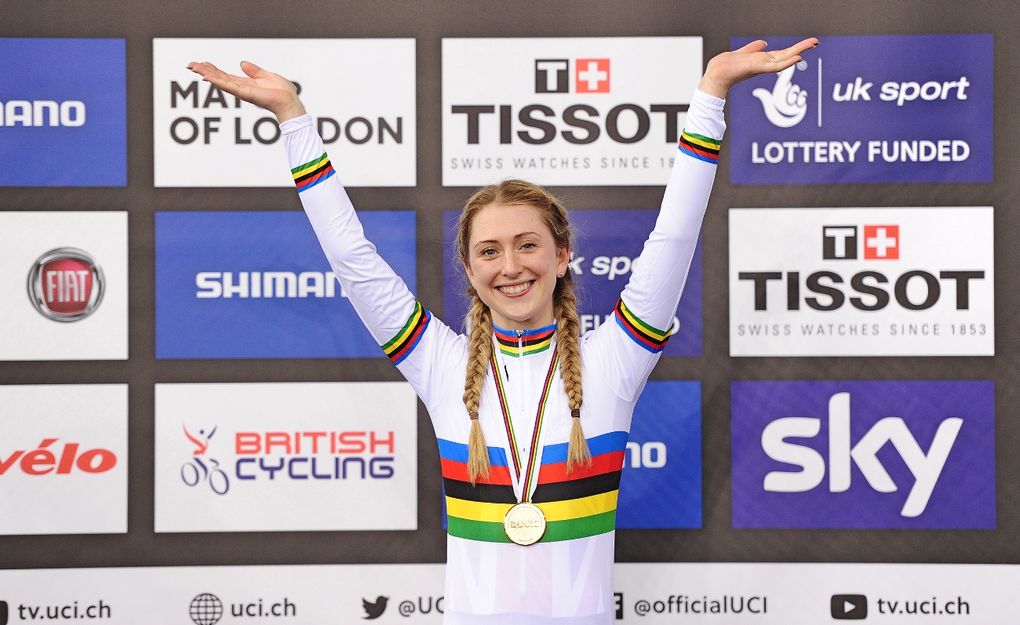 Laura Trott celebrates her scratch race win – the first British gold medal of this year’s World Championships (pic: Simon Wilkinson/SWpix)