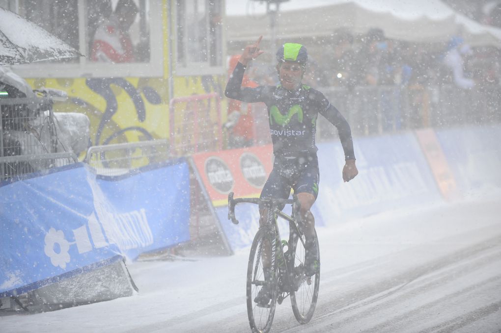 A barely-visible Nairo Quintana records a superb solo victory on stage five in the snow (Pic: Sirotti)