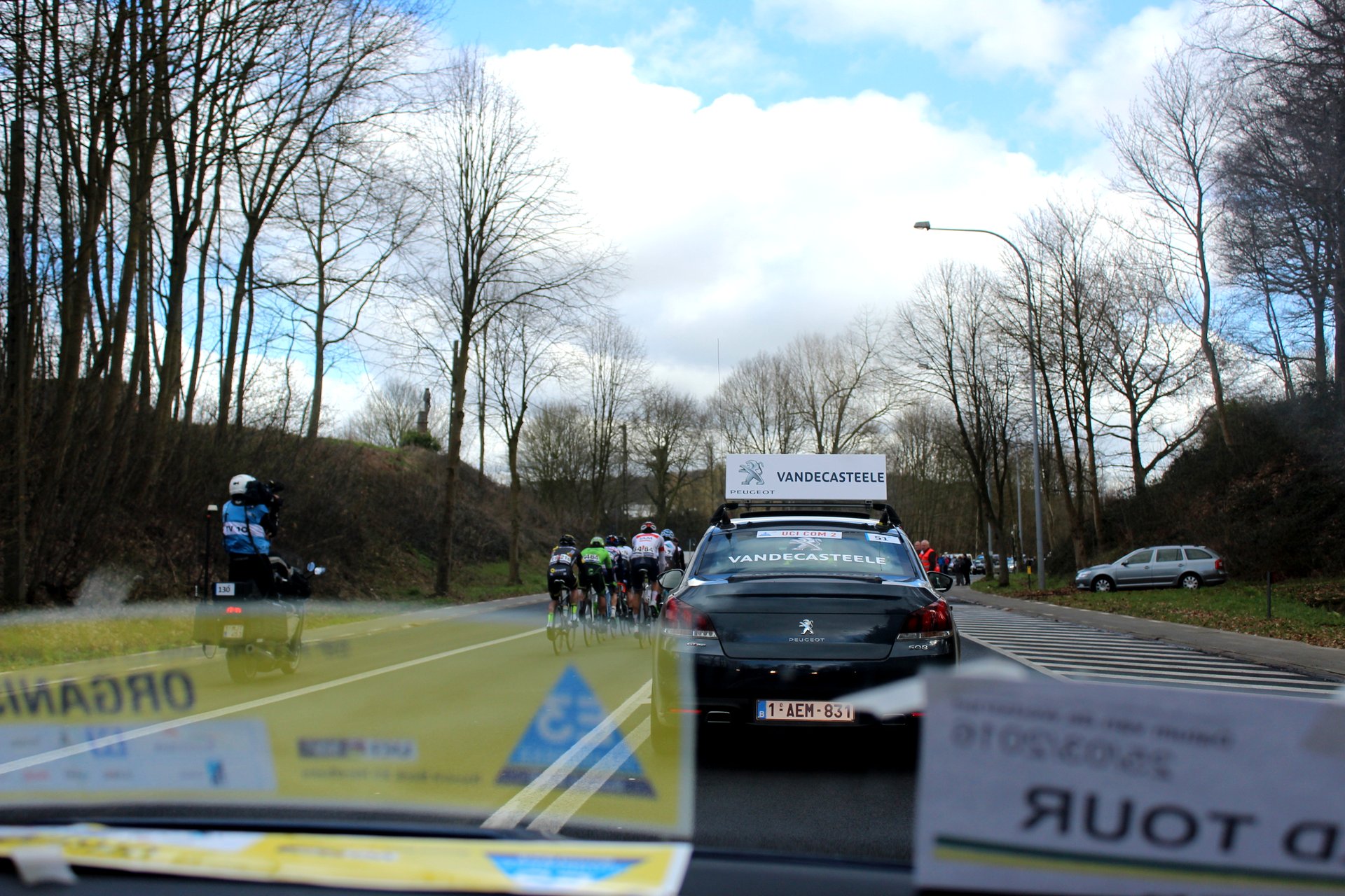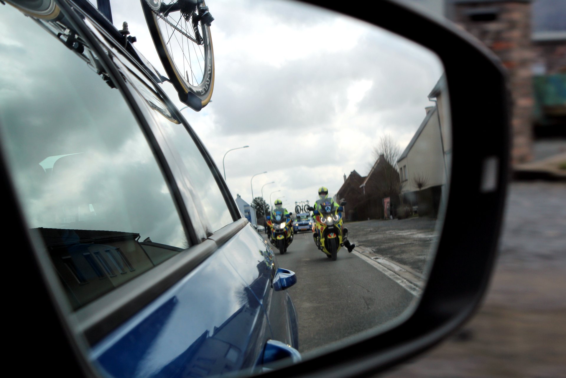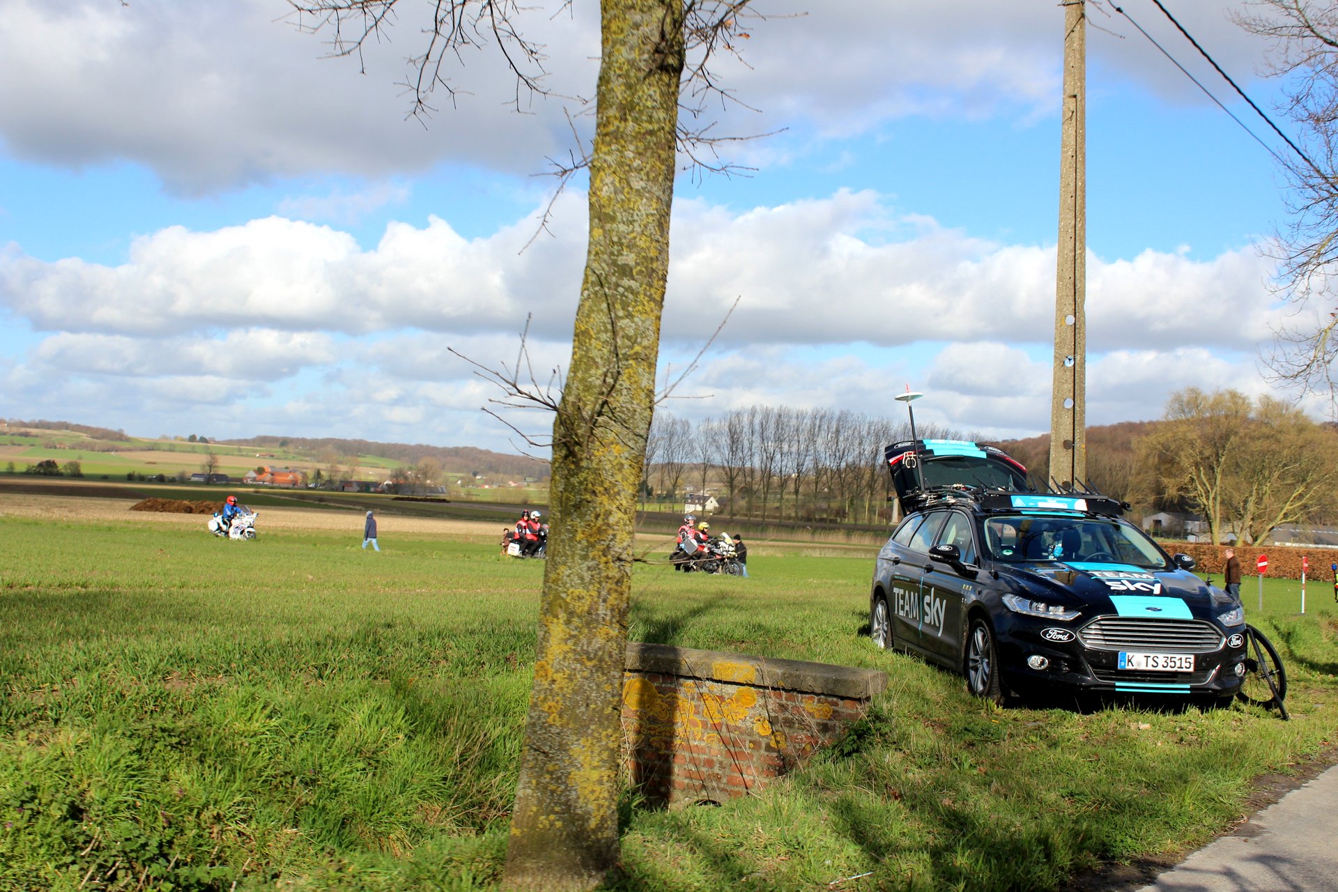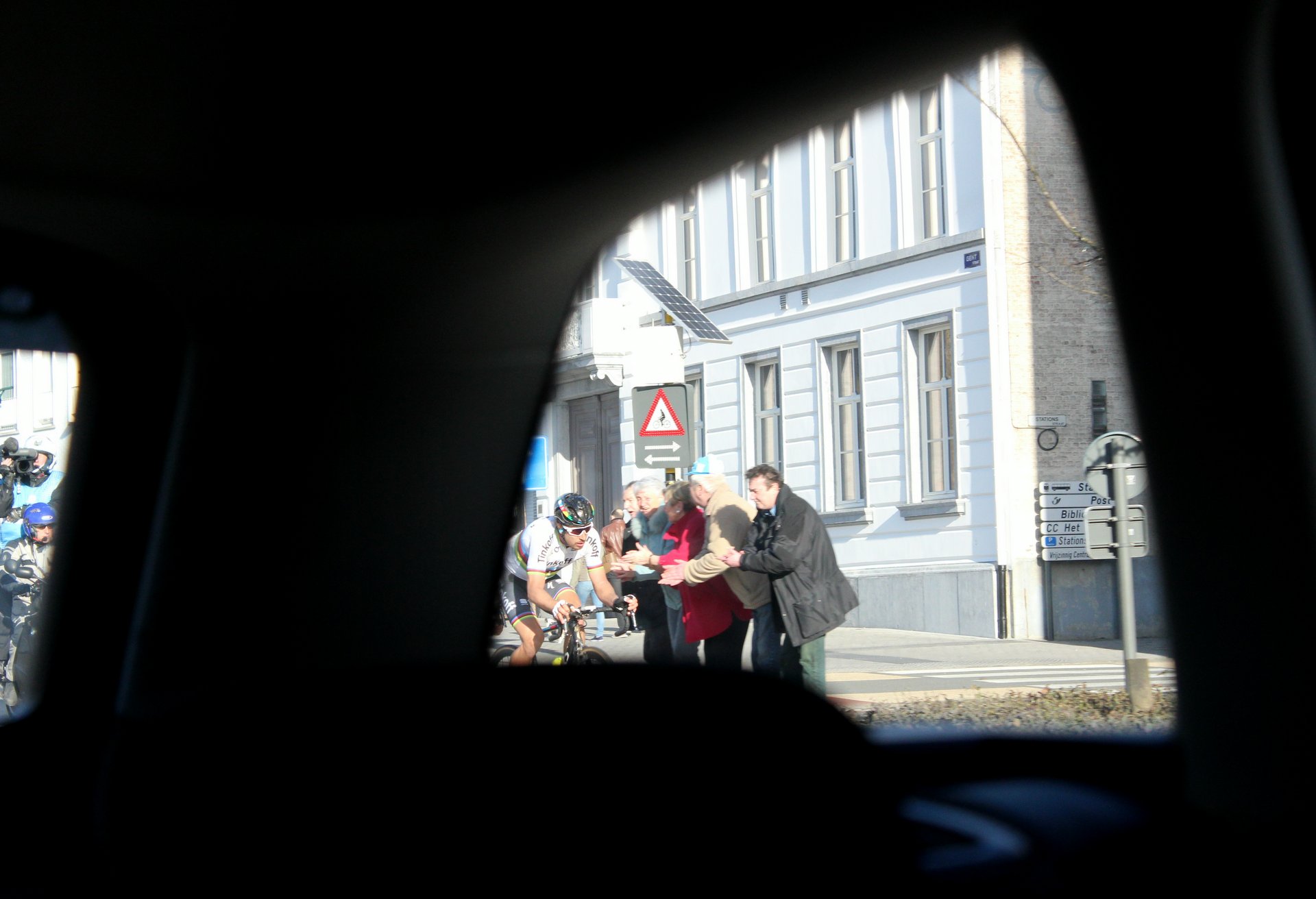 Rudie is a skilful driver, zipping along the back roads of Belgium with motos surrounding him. On television you never really see the sheer volume of motorbikes involved in a race the size of E3. It seems like every motorcycle rider in Flanders has been pulled in. There are the obvious ones, carrying TV, radio, and photographers, flitting around the head of the race, on roads barely large enough for a single car. Every junction, every piece of road furniture has an outrider on, blowing their whistle and waving their flag. These guys (seemingly all males) perform an admirable job, rolling around the race at breakneck speed. So many of them.